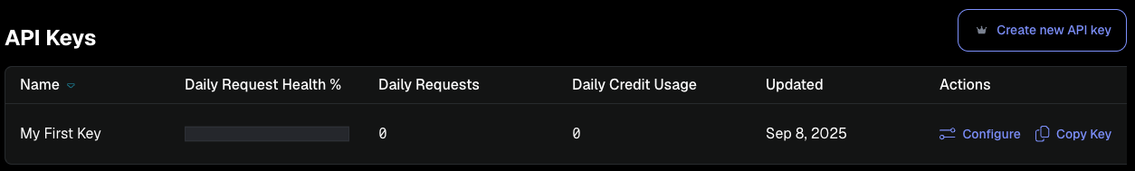 Select My First Key or the Configure link to view your API key settings.